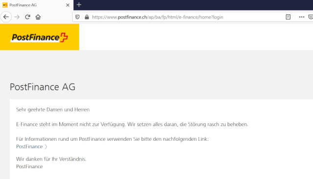 Auf der Postfinance-Seite wird eine Fehlermeldung angezeigt. Wie Postfinance online mitteilt liegt aktuell eine Störung im System vor. Die Störung habe insgesamt weniger als 30 Minuten gedauert sagte ein Sprecher der Post-Tochter zur.